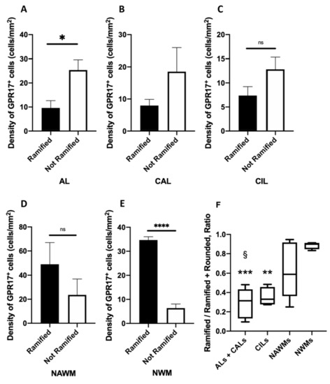 Then, we performed a comparative analysis among active lesions (ALs and CALs), CILs, NAWMs, and NWMs, in order to evaluate the correlation between a specific condition and the prevalence of ramified or rounded GPR17+ cells. For this reason, we calculated the ratio between ramified GPR17+ cells and the total GPR17+ cells in each condition and found that the ramified GPR17+ cells are more represented in NWMs than in active lesions or CILs and are more represented in NAWMs than in active lesions, whereas in all the other conditions no remarkable differences were found (Figure 5F).