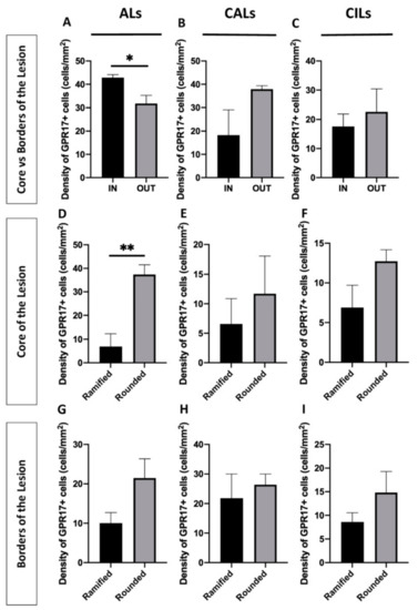 Then, we looked for the most represented morphology of GPR17+ cells at the border and in the core of ALs, CALs, and CILs. No prevalence of a particular morphology of GPR17+ cells were detected inside/outside the different lesions, except for ALs, where rounded GPR17+ cells outnumbered ramified ones inside the lesion. No differences were detected outside (Figure 6D–I).