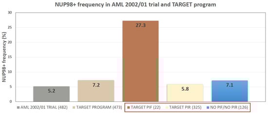 NUP98r frequency in AIEOP AML 2002/01 and TARGET program. The TARGET study distinguishes PIF from PIR patients. The three subgroups boxed in red are included in TARGET study.
