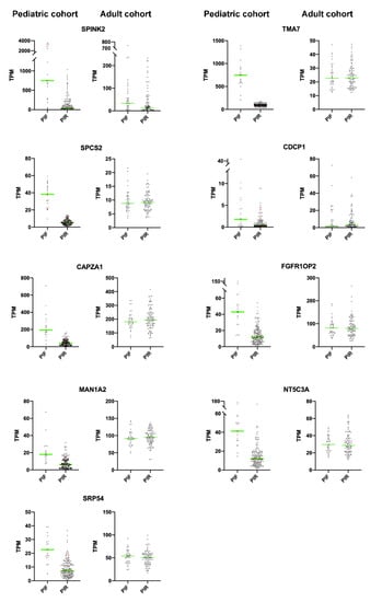 Figure 3 shows TPM values (dot plot) for both PIF and PIR patients in pediatric and adult cohorts: SPINK2 is the only gene that confirmed its significant upregulation in adult PIFs (n = 37) vs. PIRs (n = 90) (p-value < 0.05). The difference between pediatric and adult cases is in agreement with the well-known observation that the range of mutations is different in adult vs. pediatric cases. It is possible that childhood PIF AML cases are more homogeneous and mechanistically different from adult cases.