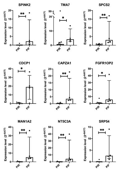 By quantitative Real-Time PCR we evaluated the transcript levels of SPINK2, TMA7, SPCS2, CDCP1, CAPZA1 FGFR1OP2, MAN1A2, NT5C3A and SRP54 in our local cohort. As shown in Figure 4, we confirmed a significant upregulation for all tested transcripts in PIF patients compared to PIR (Mann-Whitney test p-value < 0.05).