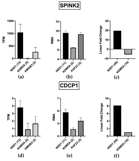 SPINK2 and CDCP1 are differentially expressed depending on NUP98r. (a,d) TARGET study shows a significant upregulation of SPINK2 and CDCP1 in presence of NUP98-NSD1 rearrangement, whilst in the first one it is almost absent in patients with NUP98-KSM5A fusion. (b,e) GSE75461 cohort establishes the higher expression of SPINK2 and CDCP1 in patients with NUP98-NSD1 compared with NUP98-KDMA5 rearrangements, revealing also a comparable expression of SPINK2 in presence of NUP98-PHF23 translocation. (c,f) Noort’s study confirms that SPINK2 and CDCP1 are dramatically upregulated in presence of NUP98-NSD1 rearrangement. For CDCP1 no significant difference in Fold Change between KDMA5+ and KDMA5− has been reported by Noort et al. We indicated a Fold Change = 1 to allow a visual comparison.