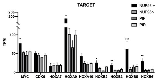 It has been repeatedly shown that overexpression of MYC, CDK6 and several members of HOXA and HOXB clusters are associated with NUP98 fusions both in human AML and in animal models [,,]. Moreover, recent studies have suggested that CDK6 is a direct transcriptional target of NUP98 fusion proteins []. With this in mind, we compared the expression of different HOXA and HOXB cluster genes, MYC and CDK6 between NUP98r+ and NUP98r− AML and PIF and PIR patients using the RNA-seq data of the Target cohort (Figure 6). Several HOXA and HOXB genes that have been reported as overexpressed in NUP98r+ in comparison to NUP98r− do not show a similar overexpression in PIF vs. PIR subgroups. CDK6 does not show significant differences among the analyzed groups, in agreement with its involvement in oncogenesis of different types of AML unrelated to NUP98 fusion proteins [].
