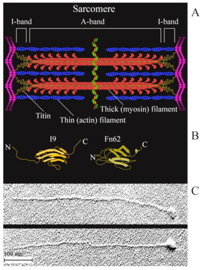 (A) a schematic structure of a sarcomere; (B) a schematic diagram of the structure of an Ig-like (I9) domain located in the I-band of the sarcomere and of an FnIII (Fn62) domain located in the A-band of the sarcomere. The domains were drawn based on the PDB file [35]; (C) electron micrographs of single straightened rabbit skeletal-muscle titin molecules produced as in [33].
