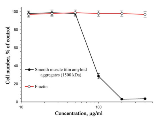 Numerous studies have shown amyloid aggregates of various proteins and peptides to impair the vital activities of cells and cause their death. Aggregates of many amyloid proteins exhibit cytotoxic properties [21,22,23,24]; however, the mechanisms of their toxic action are not yet finally clear. Research shows that mature amyloid fibrils [10], amorphous aggregates [11,25], and oligomers—products of the initial stage of amyloid aggregation [12,26,27,28]—are toxic. In this work, we investigated the action of amorphous amyloid aggregates of titin on cells.