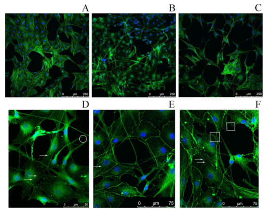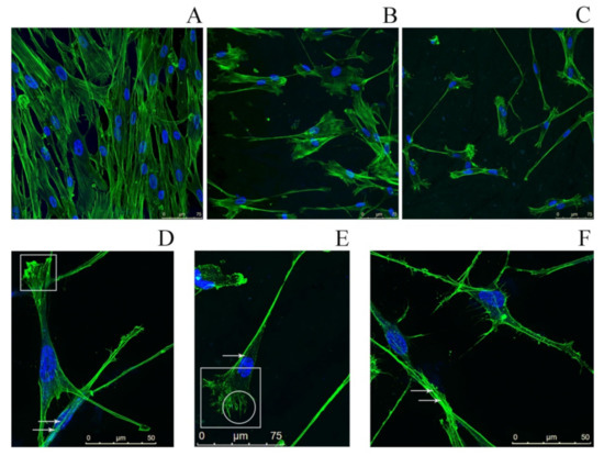 Fluorescence microscopy images of human dermal fibroblasts. (A) Fibroblasts (control) growing on a surface free of titin amyloid aggregates; staining with Phalloidin-Atto 488 (green) to visualize the actin cytoskeleton and with Hoechst 33342 (blue) to visualize cell nuclei. (B,C) Fibroblasts growing on a cover-glass surface with applied SMT aggregates (B) 48 h cultivation; (C) 72 h cultivation). (D–F) High-magnification images of fibroblasts growing on a cover-glass surface with applied SMT aggregates, incubation time 72 h. Arrows show stress fibers; in the circle, filopodia; in the squares, lamellipodia.