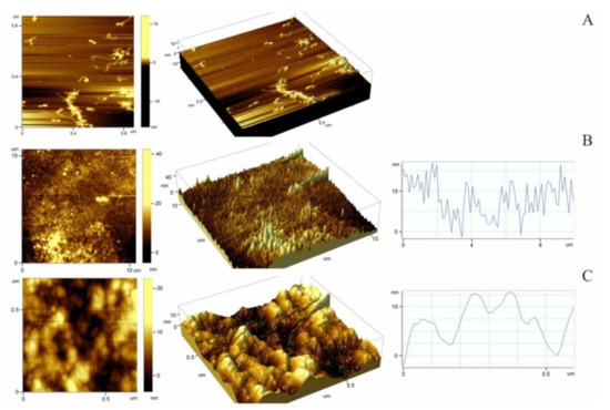 Figure 5B,C presents 2-D and 3-D AFM images, which show the morphology and nanostructure of SMT aggregates. A significant roughness of the surfaces was observed. The roughness was determined by calculating the root mean square (RMS) roughness parameter. The calculated surface roughness values varied from 2.7 to 4.9 nm depending on the scan scale, which is much greater as compared with the cover-glass controls without adsorbed titin (RMS values less than 1 nm).