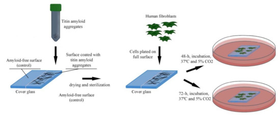 Following the analysis of the relief of a surface coated with titin amyloid aggregates, we investigated the ability of fibroblasts to attach to and grow on this surface. For this, SMT amyloid aggregates were placed onto half of the cover-glass surface. Then human fibroblasts were seeded onto the entire cover-glass surface. The scheme of the experiment is shown in Figure 6.