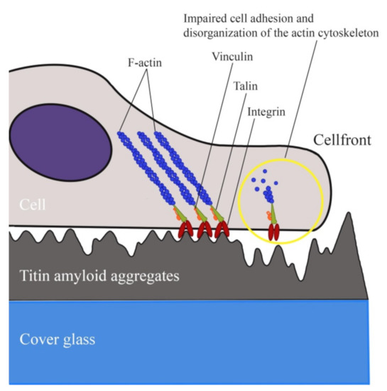 The study revealed a cytotoxic action of amyloid aggregates of SMT (MW, 1500 kDa) on smooth-muscle cells. We have observed a similar effect earlier for aggregates formed from a 500-kDa smooth-muscle isoform of titin [36]. Thus, we demonstrate the cytotoxic action on cells of SMT amyloid aggregates not to depend on the molecular weight of the protein. The toxic effect was observed not until after 72 h of smooth-muscle cells’ incubation in a medium with SMT aggregates. With this in mind, we assumed that the cell death was not related to their direct toxic action causing necrosis or apoptosis. Still, the mechanism of this toxic action remained elusive. In the process of incubation in a medium with SMT amyloid aggregates, we found that after 24 h the morphology of cells changed, they acquired a ball-like shape. Confocal microscopy revealed a partial or complete disorganization of the actin cytoskeleton, as well as morphological changes commonly occurring in adhesion impairment, such as the emergence of filopodia, lamellipodia, and stress fibers. These morphological features are indicative of a possible impairment of cell adhesion [38,39,40].