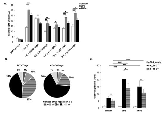 Transcription factor binding sites of NF-κB, c-Fos, and members of the SP and USF family as well as a novel GT repeat affect Il-6 promoter activity. (A) NIH3T3 cells were transiently transfected with the empty pGL4 luciferase vector (pGL4 empty) or with different reporter constructs of the Il-6 promoter (1138 bp). In the construct Il-6_1 (NF-κB)depl., the NF-κB binding site as identified by EMSA within Il-6_1 was depleted by site-directed mutagenesis. Correspondingly, the c-Fos binding site within Il-6_2 (Il-6_2(c-Fos)depl.), the c-Fos binding site within Il-6_3 (Il-6_3(c-Fos)depl.), the USF binding site within Il-6_4 (Il-6_4(USF)depl.), and the c-Fos binding site within Il-6_4 (Il-6_4(c-Fos)depl.) were mutated (4–5 independent experiments, 2 technical replicates). Cells were left in medium or stimulated with 10 ng/mL LPS or 0.5 ng/mL TNFα. (B) Il-6 luciferase promoter constructs were generated using DNA isolated from WT or CD8−/− nTregs. To determine the frequency of a GT short tandem repeat in nTregs of both strains, a total of 104 clones (WT = 51, CD8−/− = 53) were sequenced. The percentage of each of the detected GT STRs in WT or CD8−/− nTregs is depicted (C) NIH3T3 cells were transiently transfected with the empty pGL4 luciferase vector or with reporter constructs of the Il-6 promoter region containing 22 or 23 GT repeats. Cells were left in the medium or stimulated with 10 ng/mL LPS or 1 ng/mL TNFα. For all luciferase experiments, luciferase activity was normalized for transfection efficiency using the control plasmid pRL-TK. The relative luciferase activity is presented in relative light units (RLU). Paired, two tailed students t-test was performed. * p ≤ 0.05, ** p ≤ 0.01, *** p ≤ 0.001; p-value comparing different stimulation conditions: ### p ≤ 0.001.