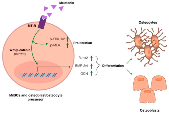 - Park, K.-H.; Kang, J.W.; Lee, E.-M.; Kim, J.S.; Rhee, Y.H.; Kim, M.; Jeong, S.J.; Park, Y.G.; Kim, S.H. Melatonin promotes osteoblastic differentiation through the BMP/ERK/Wnt signaling pathways. J. Pineal Res. 2011, 51, 187–194. [Google Scholar] [CrossRef]