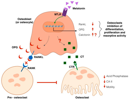 - Nakano, M.; Ikegame, M.; Igarashi-Migitaka, J.; Maruyama, Y.; Suzuki, N.; Hattori, A. Suppressive effect of melatonin on osteoclast function via osteocyte calcitonin. J. Endocrinol. 2019, 242, 13–23. [Google Scholar] [CrossRef]