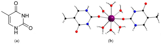 In comparison with other natural nucleobases, the coordination chemistry of thymine-based metal complexes has been much less investigated. Most of the thymine-containing complexes have been prepared with the nucleobase in the form of thyminate anion, that is, releasing one or two protons of its N-H groups, whereas the reported examples obtained with the thymine molecule acting through its carbonyl groups as a neutral ligand toward the metal are much scarcer [4,5,6,7]. In that respect, theoretical studies have been performed on metal clusters to investigate the preferential binding sites of the thymine molecule [8].