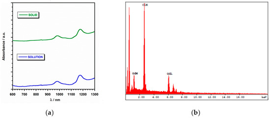 Compound 1 was prepared from a mixture of Gd2O3 and thymine, which reacted in an aqueous suspension acidulated with perchloric acid, and was stirred at 60 °C for 1 h. The resulting solution was left to evaporate at room temperature for 1 week, thus generating colorless parallelepipeds of 1. Once synthesized, 1 is air-stable over a period of several days. In order to study its stability further, electronic absorption spectra of 1 were collected both in solid state and in aqueous solution (Figure 2 and Figure S2). Remarkably, the two spectra show the same absorption bands and different ones to that of the free thymine ligand (Figure S2), with this fact indicating the stability of 1 in aqueous solution (Figure 2a). SEM-EDAX analysis gave a molar ratio of 1:3 for the Gd/Cl relation in 1 (Figure 2b).