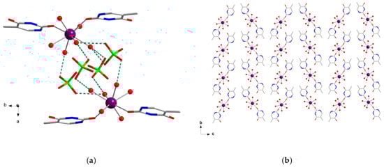 (a) View along the crystallographic c axis of the H-bonding interactions (green dashed lines) between perchlorate anions (capped sticks model) and [Gd(thy)2(H2O)6]3+ cations in 1. For the sake of clarity, H atoms are omitted and only coordinated water molecules are shown. Color code: purple, Gd; green, Cl; red, O; blue, N; grey, C; (b) View along the crystallographic a axis of the herringbone type structure of 1. H atoms, perchlorate anions, and non-coordinating water molecules have been omitted for clarity. Color code: purple, Gd; red, O; blue, N; grey, C.