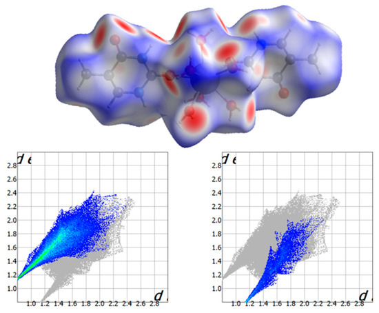 Hirshfeld surfaces of the cationic [Gd(thy)2(H2O)6]3+ complex were calculated, and its closer intermolecular interactions were analyzed through the CrystalExplorer program [29,30]. These surfaces were mapped taking into account the distance from a point on the surface to the nearest atom outside (de) and inside (di) the surface. To overcome limitations related to the size of atoms, a normalized contact distance (dnorm) was also considered [29,30]. For compound 1, Hirshfeld surfaces are shown in Figure 4 and Figure S6, where the shorter contacts are displayed using red color [31]. Intermolecular O···H contacts between water molecules and between water molecules and carbonyl groups of the thymine molecules are the main interactions detected on the Hirshfeld surface (Figure 4 and Figure S6). The most important O···H contacts are those involving H-bonds between non-coordinated and coordinated water molecules, which are approximately 48% of the complete fingerprint plot, whereas the O···H interactions involving non-coordinated water molecules and carbonyl groups are highlighted from the full fingerprint as ca. 19% of the plot. Finally, additional N···H contacts involving non-coordinated water molecules and N-H groups of the thymine molecules only cover approximately 2% of the fingerprint plot (Figure 4).