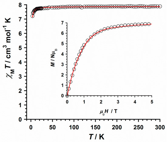 χMT vs. T plot obtained for compound 1. The inset shows the field dependence of the molar magnetization (M) plot at 2.0 K for 1. The solid red lines represent the best fit of the experimental data.