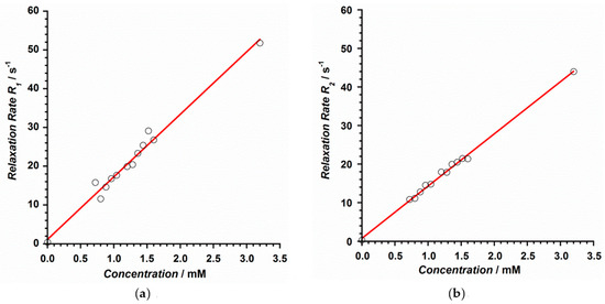 Relaxation rate vs. contrast concentration plot obtained for the relaxivities r1 (a) and r2 (b) of compound 1. The red line represents the best linear fit of the experimental data.