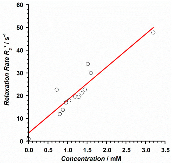 Relaxation rate vs. contrast concentration plot obtained for the relaxivity r2* of compound 1. The red line represents the best linear fit of the experimental data.