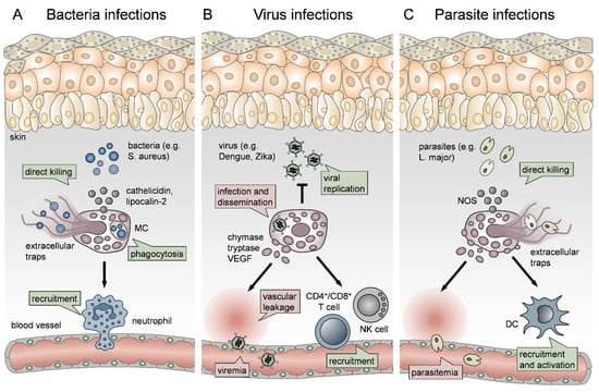 The crucial role and dichotomy of mast cells (MCs) in cutaneous infections. (A) MCs critically contribute to host defenses against bacteria via direct killing, phagocytosis and the recruitment of neutrophils. (B) In viral infections, MCs control viral replication locally in the skin and promote the recruitment of natural killer cells (NK), CD4+ and CD8+ T cells, but also contribute to viral dissemination and viremia. (C) MCs control parasite infections via the release of nitric oxide species (NOS) and the formation of extracellular traps, as well as by promoting dendritic cell (DC) recruitment and activation, but can also contribute to parasite dissemination. Beneficial MC effects are displayed in green boxes; detrimental MC functions are shown in red boxes.