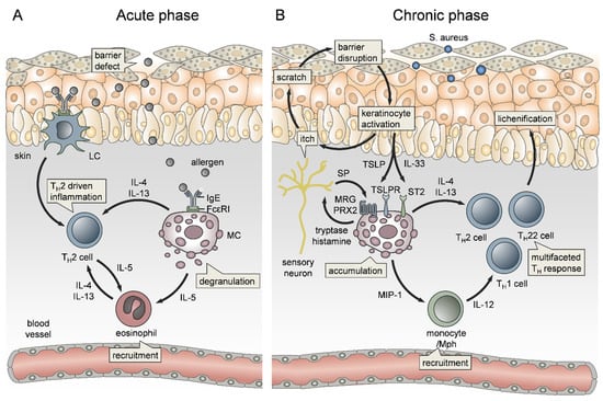 Depending on the route of activation, MCs can bridge innate and adaptive immunity and thereby contribute to allergic sensitization in the skin and lung [215]. For example, MC-derived IL-13 has been demonstrated to downregulate IL-12 production by skin DCs, thereby inhibiting the TH1 cell response to cutaneous antigen exposure [216]. Likewise, MCs counter-regulate IFN-γ expression in sensitized skin [217]. The pattern of cytokine expression in AD depends on the acuity or duration of the skin lesion. The acute onset of skin inflammation is associated with a predominance of TH2 cell infiltration and IL-4 expression (Figure 2A). In contrast, macrophage and Eos activation are dominant in chronic AD, where MC-derived cytokines, chemokines and MC interaction with the vessel endothelium contribute to monocyte recruitment (Figure 2B) [218,219]. The ongoing cytokine expression, local expansion of Th2 cells and pathologic keratinocyte damage caused by scratching or microbial agents (e.g., Staphylococcus aureus) amplify tissue inflammation. KCs release a spectrum of cytokines, such as IL-1β, IL-25, IL-33, thymic stromal lymphopoietin (TSLP), as well as the alarmins ATP and HMGB1 that skew DC towards type 2 immunity, further boosting MC effector functions [220]. Specifically, in AD, TLSP stimulates MC accumulation and Th2 cytokine production, which directs epithelial cell-mediated, IgE-independent MC activation that exacerbates disease severity (Figure 2B) [221,222,223,224]. Furthermore, it has been recently shown that TSLP can activate human MCs directly through cooperating with MRGPRX2, shedding some light on its IgE-independent mode of action [225]. Notably, TSLP is also produced by MCs in a caspase-1/NFκB-dependent way [226]. In line with TSLP, IL-33 release by KCs acts on TH2 cells, MCs and Eos, the key drivers of AD (Figure 2B), via the specific receptor ST2 [227]. IL-33 affects several MC functions, including growth, survival, and mediator release (as reviewed in [228]). In vitro, IL-33 was thought to fail direct induction of MC degranulation but to amplify the release of de novo synthesized lipid mediators and cytokines. However, we demonstrated that IL-33 initiates MC degranulation and MC-mediated edema formation and Nph recruitment in vivo [90,229], which may result from concomitant signaling of extracellular ATP via the purinergic receptor P2X7. Indeed, transgenic expression of IL-33 by KCs resulted in MC accumulation, increased blood histamine and total IgE levels, and increased levels of IL-5, IL-13, CCL5, and eotaxin 1 in blood and lesional skin, thereby closely resembling the AD features [230]. Notably, in a murine model, MCs were found to express MHC class II after prolonged exposure to IL-33, suggesting a possible role for MCs in promoting the vicious cycle of response to/induction of type 2 immunity [231].