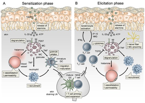 Notably, MC-derived TNF has been additionally shown to promote nerve fiber elongation during CHS, as well as closer MC proximity to nerves (Figure 3B) [294]. Since ACD is manifested as a pruritic inflammatory skin disorder, MC’s contribution to both histaminergic and non-histaminergic itch might be considered [295]. Moreover, models of repeated antigen challenge have been used to study MC effects in chronic ACD. Here, MCs accumulate in an L-selectin and ICAM-1 dependent manner and shift the delayed-type to an immediate-type response [296]. Interestingly, Gimenez-Rivera demonstrated that MCs limit the exacerbation of chronic ACD by controlling TH1 and TH17 cytokines, and CD8+ tissue-resident memory T (TRM) cells, probably by degradation of the CD8+ T cell mitogen IL-15 [297]. In vitro, persistent exposure of human MCs to IL-33, as occurring in chronic inflammatory skin disorders, attenuated degranulation and FcεRI expression but induced amplified histamine production [298].
