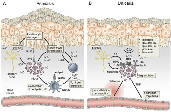 Psoriasis is considered to be an autoimmune disorder that is characterized by massive immune cell infiltration into the dermis and epidermis, followed by an abnormal proliferation of KCs [308]. The skin disease is perpetuated by both innate and adaptive mechanisms (Figure 4A) and, although the inflammation appears locally in the skin, it involves detrimental effects on patient quality of life and may be even accompanied by systemic manifestations [309]. MCs have been investigated early in the context of psoriasis, and it was demonstrated that MC degranulation is a constant and early feature in disease development [310]. Another study showed that MCs in psoriatic skin lesions were functionally hyperactive and suspected that histamine is involved in disease pathophysiology [311]. Indeed, MCs have been implicated in the onset of neuropathic pain, itching and pruritus (Figure 4A), the latter being some of the main symptoms of psoriasis [245]. This is triggered by a plethora of MC mediators, including histamine, tryptase, cytokines and growth factors [240]. In a recent study, Nobuo et al. reported the relationship between MCs and pruritus in a mouse model of imiquimod-induced psoriasis, showing that self-scratching behavior during the onset of psoriasis led to increased MC numbers, which, in turn, induce pruritus through the release of nerve growth factor (NGF) (Figure 4A) [312]. Notably, a recent study has employed transcriptional profiling to establish a common signature for itchy psoriatic and AD skin, showing that many MC genes, such as tryptase, phospholipase A2 (PLA2), IL-6, IL-17, IL-22 and MRGPRX2, were commonly upregulated between the two types of pruritus [313].