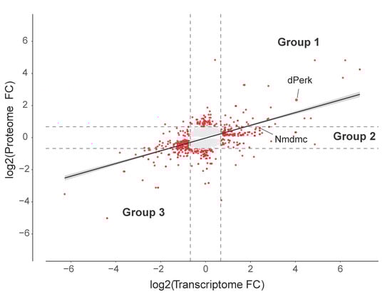 2.4. Analysis of the dPerk-Induced Correlations between Transcript and Protein Levels
