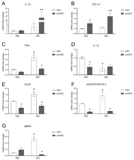 2.4. High Glucose Effects on ASC mRNA Levels of Anti-Inflammatory Cytokines, Pro-Inflammatory Cytokines, and Angiogenic Factors