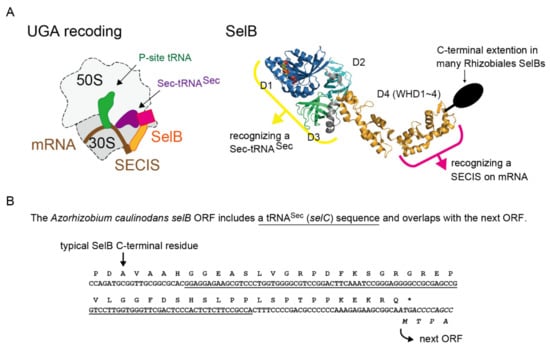 Elongation factor SelB and Sec-tRNASec. (A) The mechanism of the SECIS-dependent recoding of the UGA codon for Sec by the SelB●SECIS●Sec-tRNASec complex (modified from [,]). Many of the Rhizobiales SelB sequences were annotated to have a C-terminal extension, which is indicated as an additional domain appended to the C-terminus of the crystal structure picture of Aquifex aeolicus SelB composed of four domains (PDB id: 4ZU9). (B) The Azorhizobium caulinodans selC (tRNASec) sequence is nested inside the ORF of the selB gene. The star indicates a translational stop signal.