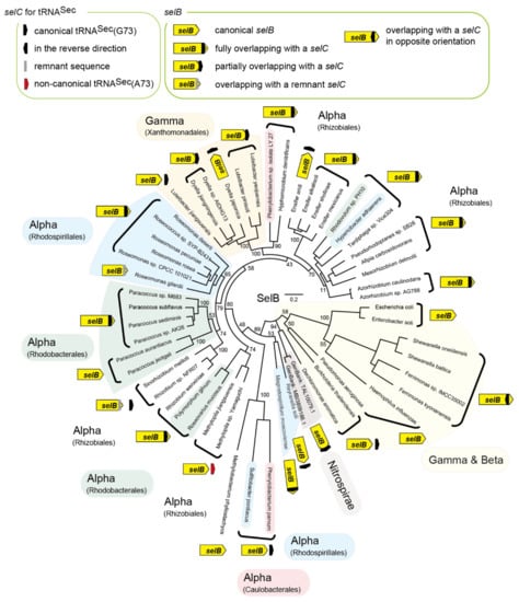 As shown in Figure 1B, it was found that an entire tRNASec sequence is nested inside the ORF of the selB gene of an Rhizobiales bacterium Azorhizobium caulinodans. The stop codon of the selB gene overlaps with the start codon of the next ORF. Thus, the C-terminal extension results from the translation of the tRNASec sequence into amino acids. Since overlapping of stop and start codons is common for polycistronic mRNAs and may support translation re-initiation [], the annotation of the ORFs may be true. Is this common in Rhizobiales and in other orders of Alphaproteobacteria? I performed a bioinformatic analysis of selB and selC genes. In Figure 2, the distribution of the selB-selC overlapping trait is overlaid on the phylogenetic tree of SelB sequences analyzed in this study. In summary, I found several types of overlapping genes and the penetrance of the overlapping trait even outside the Alphaproteobacteria class. In Alphaproteobacteria, diverse species of Rhizobiales and a few groups of Rhodobacterales, Rhodospirillales, and Caulobacterales have a selC nested inside the selB gene (Figure 3). In many cases, the stop codon of the selB ORF overlaps with the start codon of the next ORF. In most cases, the selC-encoded tRNASec sequence is 96 nucleotide residues in length or 93 residues (due to the lack of the CCA tail in the selC gene), which may facilitate the maintenance of the reading frame. Some species have lost the overlap (Figure 3); Methylopila species have a new stop codon before the selC sequence, while some Ensifer species have a long spacer between the selB and selC genes. These results clearly suggested that the overlapping trait is highly conserved but is not essential.