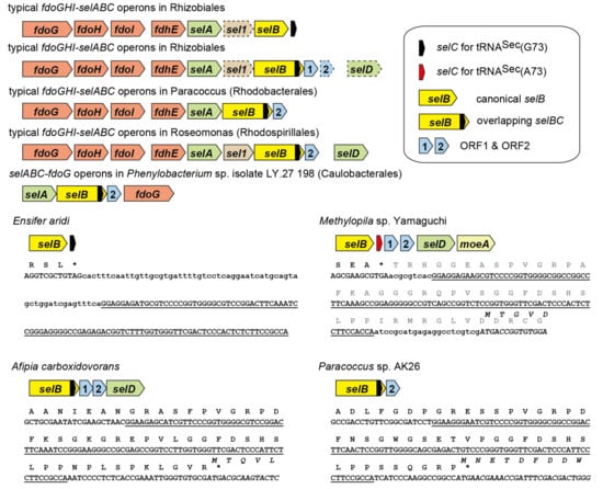 Bioinformatic analysis of fdoGHI and selABC gene clusters in four orders of Alphaproteobacteria (Rhizobiales, Rhodobacterales, Rhodospirillales, Caulobacterales). The fdoGHI genes encode a membrane-bound formate dehydrogenase (FDH-O) carrying a catalytic Sec residue. The SelD proteins synthesize selenophosphate which is the selenium donor used by SelA. The SelD and Sel1-like proteins are not selenoproteins in these bacteria. The two ORFs associating with the overlapping selBC gene were named ORF1 and ORF2 in this study. As reported previously [], Methylophila spp. use a tRNASec with a non-canonical discriminator base A73 instead of G73. Sequence information of the overlapping selBC genes were provided. The stars indicate a translational stop signal. The tRNASec sequences were underlined. The reading frames of ORF1 or ORF2 were italicized.