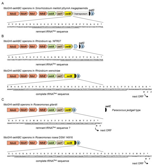 It is known that the selAB genes and the selCD genes are separated by a transposon in S. meliloti pSymA megaplasmid [,]. However, the S. meliloti SelB has a C-terminal extension [] which is slightly shorter than that of A. caulinodans SelB. It was revealed that the 5′ half of the overlapping tRNASec sequence remains in the S. meliloti selB ORF (Figure 4A). Thus, the shorter C-terminal extension results from the translation of the remnant tRNASec sequence into amino acids. The transposon insertion may have generated a new stop codon for the pSymA selB gene. A similar case was found in a lineage of Rhizobium (Figure 4B). Rhizobium sp. NFR07 has a remnant tRNASec sequence in the selB gene, while Rhizobium wenxiniae has a complete tRNASec sequence nested in the selB gene. Roseomonas gilardii and R. mucosa also have a SelB with a shorter C-terminal extension, while their remnant tRNASec sequences seem to be highly degenerate (Figure 4C). The C-terminal extension may facilitate the translational coupling of the selB ORF and the ORF2 in these Roseomonas lineages (Figure 4C).