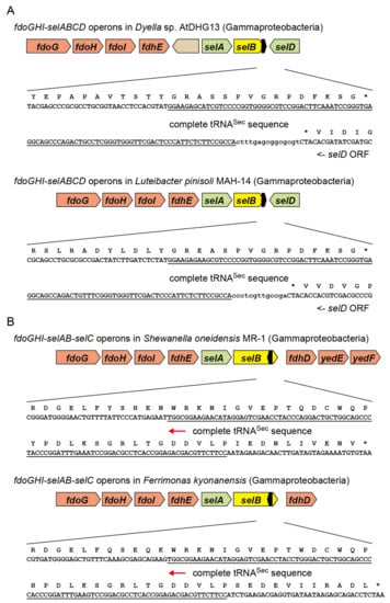 It was speculated that the fdoGHI-selABCD gene cluster has been transferred among the Alphaproteobacteria, Betaproteobacteria, and Gammaproteobacteria clades via horizontal gene transfer []. Some Gammaproteobacteria species belonging to the Rhodanobacteraceae family in the Xanthomonadales order have a SelB species resembling Rhizobiales SelBs. Thus, it was assessed whether the selB-selC overlapping trait was also transferred from Alphaproteobacteria to Gammaproteobacteria. Interestingly, a few groups of Dyella and Luteibacter have a selB gene whose stop codon lies in the middle of the overlapping tRNASec sequence at the same position (from nucleotide residue 46 to 48) (Figure 5A). In contrast, their closely related strains have a new stop codon for the selB gene before the tRNASec sequence. Thus, the selB-selC overlapping trait may have been conserved for a period in the two Gammaproteobacteria lineages. A similar case was found in a groundwater lineage of Nitrospirae (Figure 2), although the SelB and SelC sequences differ significantly from those of Dyella and Luteibacter as well as Alphaproteobacteria. On the other hand, the overlapping traits of selB with ORF1 or ORF2 were not found outside the Alphaproteobacteria class. Rather, the distribution of the ORF1 and ORF2 genes is limited to Alphaproteobacteria.