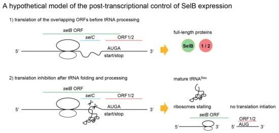 Figure 7 shows a proposed model of the translation regulation by the nested tRNA moiety. Once the tRNA moiety folded into a tertiary structure, the exact 5′ end and the 3′ trailer may be cleaved by RNases [,,]. This tRNA processing will generate a nonstop mRNA for SelB and a leader-less mRNA for ORF1 or ORF2, leading to the repression of the expression of SelB and ORF1/2 proteins (Figure 7). In other words, the expressions of SelB and tRNASec molecules are alternatives. As discussed later, a similar mechanism was hypothesized for a mitochondrial tRNA gene nested in a protein gene []. Because the excess of SelB over Sec-tRNASec may lead to sequestration of Sec-tRNASec molecules due to the extraordinary high affinity [,], the SelB expression level should be maintained to be low but enough for mediating the UGA-recoding. It is not clear whether or how this hypothetical mechanism would be regulated under selenium deficiency.