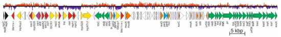 Schematic representation of pCTX-M3 sequence. Open reading frames (ORFs) are represented by arrows indicating their orientation. Genes encoding the replicon are in black, post-segregational killing and partition systems in blue, and conjugative transfer in green. Drug resistance genes are in red, transposase genes in yellow, other genes with homologues in databases in orange, and those of known functions are subscribed. A G+C plot is presented at the top; values higher than the average are in red and lower in purple.