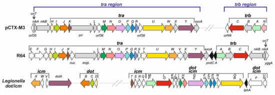 Gene organization of the transfer regions of pCTX-M3 and R64 and the dot/icm region of Legionella pneumophila. ORFs homologous in all systems are indicated by coloring. ORFs homologous in both plasmids are shown in grey, and those unique to one system only are shown in white. Gene group designation is indicated in brackets and individual genes are marked with appropriate letters. ORFs unrelated to the conjugation system are shown as black arrows.