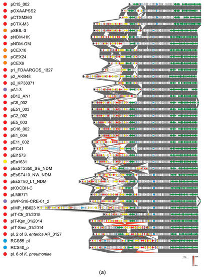 All known plasmids with 100% identity of their replicon region to the corresponding sequence of pCTX-M3 (1658 bp, starting 74 bp upstream of repC through repA, comprising repCBA and the RNA I-encoding sequence), found in the GenBank database (as of 25 March 2021), should be considered members of the pCTX-M3 family. They were found in Enterobacteriaceae strains (Enterobacterales ord. nov.) associated with health care (K. pneumoniae, E. coli, C. freundii, Serratia marcescens, Enterobacter cloacae, E. hormaechei, S. enterica subsp. enterica serovar Senftenberg, K. michiganensis, Enterobacter kobei, and Leclercia adecarboxylata). Some were also isolated from farm animals (from K. pneumonia, E. coli, E. cloacae, and S. enterica subsp. enterica serovar Havana), and additionally, a few originated from bacteria from municipal wastewater (K. pneumonia and E. cloacae), and one from Klebsiella aerogenes (pEa1631) from wildlife. Altogether, these environments indicate a vast diversity of reservoirs of the pCTX-M3 family plasmids. The 39 members of this family are shown in Figure 3a to the exclusion of sequences coming from the same survey and differing only in single nucleotides. As described above in detail for pCTX-M3, in most family members the modules comprising genes conferring antibiotic resistance can be found in two locations: the MRR between the rep region and the trb genes, and the shorter one downstream of pemK. The MRRs of the pCTX-M3 family plasmids, shown in Figure 3b, comprise a striking variety of genes conferring resistance to:
