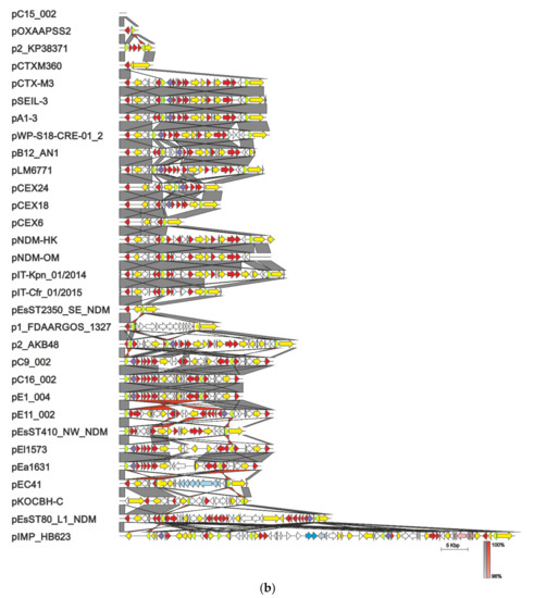 - Bonnin, R.A.; Nordmann, P.; Carattoli, A.; Poirel, L. Comparative Genomics of IncL/M-Type Plasmids: Evolution by Acquisition of Resistance Genes and Insertion Sequences. Antimicrob. Agents Chemother. 2013, 57, 674–676. [Google Scholar] [CrossRef]