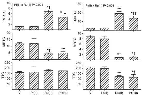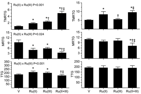 As for the next two venoms tested, the results obtained with E. leucogaster venom and O. microlepidotus venom are displayed in the left and right panels of Figure 3, respectively. With regard to E. leucogaster venom, exposure to 100 µM CORM-2 resulted in a significant increase in TMRTG and decrease in MRTG values compared to CORM-2 naïve venom, demonstrating procoagulant activity inhibition. Similarly, exposure of E. leucogaster venom to 100 µM RuCl3 significantly diminished procoagulant activity, evidenced by an increase in TMRTG values and a decrease in MRTG values compared to venom not exposed to RuCl3. However, the inhibition of procoagulant activity was significantly less than that observed with CORM-2. When E. leucogaster venom was exposed to the combination of CORM-2 and RuCl3, TMRTG values were significantly more increased compared to all other conditions. Inhibition of venom activity assessed by changes in TMRTG due to a significant interaction of the two Ru-based compounds was also present. Further, MRTG values were significantly decreased compared to venom without exposures and venom exposed to RuCl3 but not different from venom exposed only to CORM-2. Lastly, there were no significant changes in TTG values between the conditions.