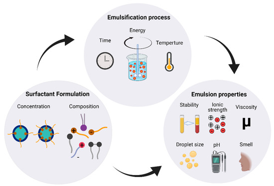 The relationship of the surfactant formulation with the other scales involved in the design of an emulsified product (formulation, process, and properties). The surfactant formulation variables (concentration and composition) are related to the emulsification process variables such as the emulsification time, energy incorporated into the emulsion, and temperature. Additionally, the emulsion properties also depend on the surfactant formulation and the emulsification process variables (created with BioRender®, San Francisco, CA, USA).