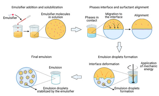 Process of emulsification. During the emulsifier addition and solubilization stage, the emulsifier is added to one of the phases and it dissolves homogeneously in the solution. Next, at the phases interface and surfactant alignment stage, emulsifier molecules migrate to the interface and align their moieties depending on their affinity. The reduction of the interfacial tension allows the interface to deform with the aid of mechanical forces, as shown at the emulsion droplets formation stage. Finally, droplets of one liquid inside the other are formed and stabilized, and therefore, the final emulsion is produced (created with BioRender®, San Francisco, CA, USA).