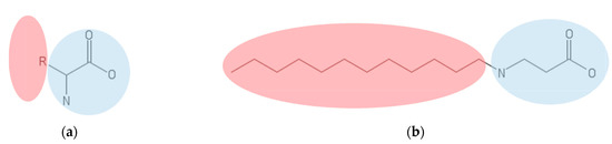 Distribution of the hydrophilic head (blue) and hydrophobic tail (pink) in (a) amino acids and (b) dodecyl-β-alanine. The hydrophilic head of both molecules have a similar chemical structure, but the amino acids have no surfactant activity while the dodecyl-β-alanine has the ability to reduce the tension of air–water interfaces.