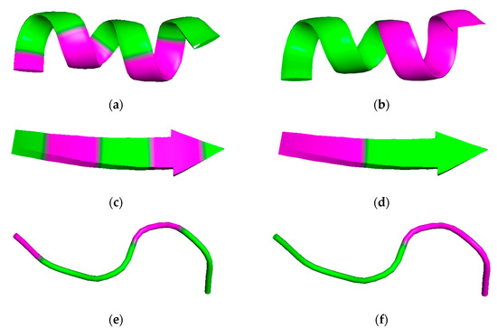 Secondary structures of amphipathic peptides: (a) facial α-helix, (b) perpendicular α-helix, (c) facial β-sheet, (d) perpendicular β-sheet, (e) facial unordered, and (f) perpendicular unordered. Green and purple sections represent hydrophilic and hydrophobic portions, respectively (created with PyMol 2.4.0®, New York, NY 10036-4041, USA).