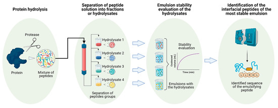 Most recent reviews on bioemulsifiers fail to include peptides as a subcategory of significant relevance [16,17,21]. This review, therefore, provides a comprehensive view of the information needed to understand the performance of peptides with emulsifying properties. Additionally, a thorough discussion is provided on the procedures to discover and design emulsifier peptides. First, the behavior of emulsifying peptides is explained in light of the functional chemical groups present in conventional emulsifiers. Second, the molecular structure–function relationships underlying the emulsifying behavior of peptides are described. Third, the routes used to discover and design emulsifying peptides such as hydrolyzation of proteins, in silico prediction and evaluation tools, de novo design, mimetizing peptides with attractive behavior in similar applications, and manipulating peptides at the O/W interface are addressed. Finally, the challenges and opportunities in the development of novel emulsifying peptides are explained, along with the introduction of a new approach based on the analysis of property databases for the estimation and optimization of the emulsifying behavior.