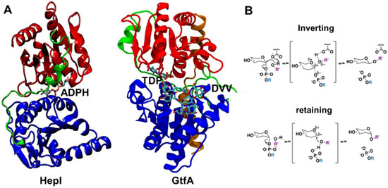 The largest subset of identified GTs in the Carbohydrate-active enzyme (CAZy) database corresponds to the bidomain Leloir-GTs (monosaccharide-nucleotide dependent) [12]. The GTs in the CAZy database have been classified into 111 different enzyme families based upon their primary sequences, with individual domains of Leloir-GTs named according to their relative primary sequence arrangement (N and C domains), while their combined spatial configurations determine the structural superfamily (GT-A, GT-B, among others) [13]. Regardless of the structural superfamily classification, Leloir-GT structures depict the nucleotide binding Rossman fold (βαβ) motif as a conserved feature that comprises the core of all resolved domains. In GT-A proteins, two Rossman domains are aligned to create a seven-stranded β-sheet at the core of the proteins which undergoes modest structural rearrangements over the course of the transfer reaction, mostly the result of loop region movements [14,15]. GT-B glycosyltransferases such as Heptosyltransferase I (HepI) and TDP-epi-vancosaminyltransferase (GtfA) consist of topologically identical Rossman-like domains joined by an extended linker (loop-α-loop) region, also known as the spine region, that are positioned in a stacked configuration (Figure 1). This arrangement generates a central inter-domain cavity that serves as the binding site for both ligands and contains the enzyme’s catalytic core. The binding position of each ligand in the GT-B cavity is domain-specific, as the N and C domains demonstrate selective binding affinity towards the acceptor substrate and sugar donor substrate, respectively, and the two domains undergo conformational transitions to bring the two domains proximal prior to catalysis [3,4,5]. The location of the ligands in the binding pocket further divides the cavity into catalytic (proximal to active site residues) and non-catalytic regions. GTs are further classified mechanistically as either configuration-retaining or configuration-inverting (Figure 1) [10]. The classification is given by comparing the stereochemistry of the newly formed glycosidic linkage of the product to that of the starting sugar donor substrate.