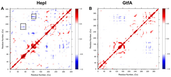 Examination of the dynamic cross-correlation matrices (Figure 5) shows that residues near each other in their primary sequence demonstrate strong positively correlated motions, as illustrated by the deep red coloring on and near the diagonal of the matrix for both HepI and GtfA. Additionally, off-diagonal regions within the same domain predominantly demonstrate strong positively correlated motions, while off-diagonal regions that represent the relationship between the two domains (i.e., HepI N-terminal domain residues 1–152 with C-terminal domain residues 180–322) demonstrate predominantly negatively correlated motions.