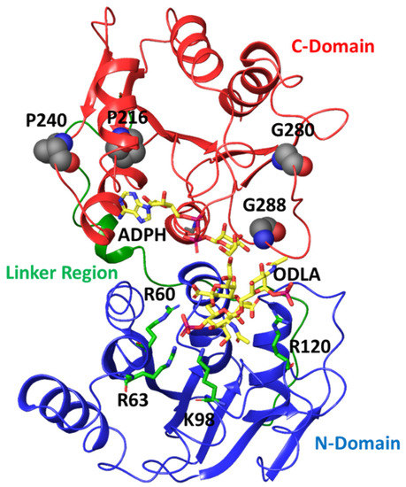 Crystal structure of HepI (PDB: 2H1H) with N domain, C domain and linker region colored in blue, red, green, respectively. The modeled ADPH and ODLA substrates (both in yellow) highlight the location of the catalytic site. The positively charged residues (R60, R63, K98 and R120) involved in FDLA binding are shown as stick representations. The four distal nonionizable residues (P216, P240, G280 and G288) located in the C-domain are shown in spacefill representation.