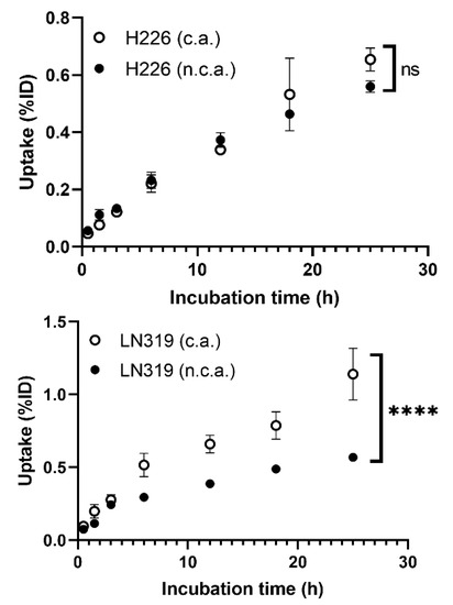 Cellular uptake of radio-cisplatin in H226 and LN319 cells. Incubated dose (ID) = 31 kBq/189Pt + 25 kBq/191Pt of radio-cisplatin with 0 (n.c.a.) or 2.5 µg (c.a.) of non-radioactive cisplatin. Data are expressed as means ± SD (n = 3). ns: not significant, **** p < 0.0001. H226 (4 × 104 cells/well) and LN319 (1 × 105 cells/well) cells were seeded 1 day before the assay.