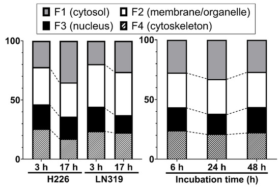 Intracellular distribution of radio-cisplatin in H226 and LN319 cells at 3 h and 17 h after incubation in FBS-free medium (left), and in LN319 after incubation for 6–48 h in medium containing FBS (right). F1, cytosolic fraction; F2, membrane/organelle protein fraction; F3: nucleic protein fraction; F4: cytoskeletal fraction.
